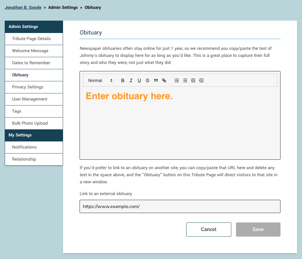 Alternative option: If you'd like to direct visitors to an existing online obituary, you can paste a URL in the "Link to an external obituary" field.