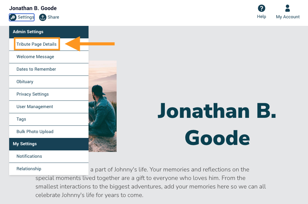 An honoree's photo will display at the top of their tribute page, welcoming your visitors. As an admin, you're welcome to change this photo at any time.